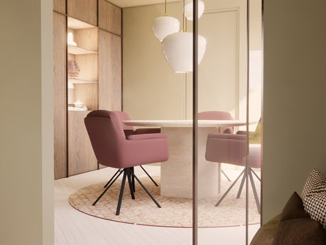 Via de speelkamer is er een geheime doorgang naar de werkkamer — een plek die niet aanvoelt als werkkamer, dankzij de ronde tafel en lichte indeling. Een perfecte plek voor koffie in de ochtend.